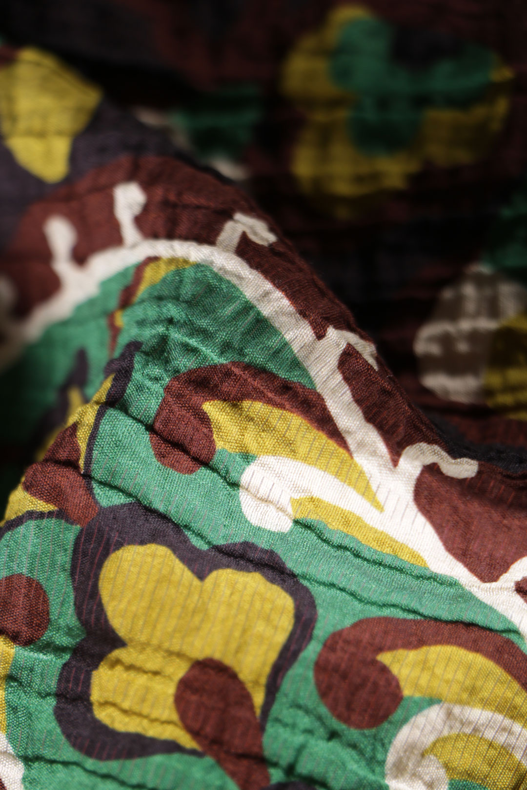 Un omaggio alle suggestioni etniche, tra stampe cachemire, ramage e jacquard ricchi di colore. L’attenzione è rivolta al bilanciamento tra disegno e cromia, per un impatto visivo forte e contemporaneo. - Macchie & Pelli